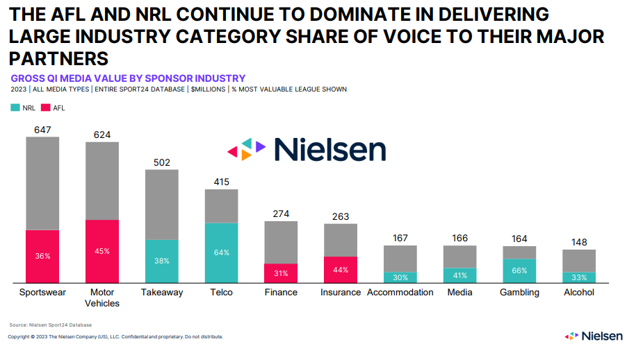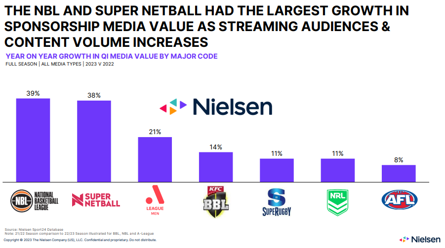 Despite the Australian Football League (AFL) and National Rugby League (NRL) continuing to lead in delivering media value to sponsors, the NBL has seen 39% growth, while Super Netball was up 38%.